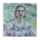 This design features a painting by the American Impressionist artist Robert Lewis Reid (1862–1929). It shows a beautiful young woman in a verdant landscape. The woman is holding flowers that are purple and violet. Her dress is a similar colour, and she is also wearing purple lipstick. She is holding the bouquet of flowers in her arms.