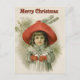 Sweet vintage girl is ready to play. Her arms are full of snowballs and she is wearing an elegant red hat with feathers. Pine branches accent the background.