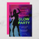 This invitation features a teenage birthday glow party theme. The neon green text is a bright contrast against the dark background. A silhouette graphic of teenagers dancing is the perfect accent.