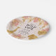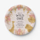 These "wild one" jungle safari themed girl's first birthday party paper plates feature gold faux foil animals (giraffe, lion and monkeys), gold and pink jungle foliage, and a sprinkling of gold confetti on a pale pink background. Add the name of the birthday girl and other text in black.