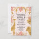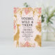 This "young, wild and three" jungle safari themed girl's third birthday party invitation features gold faux foil animals (giraffe, lion and monkeys), gold and pink jungle foliage, and a sprinkling of gold confetti on a pastel pink background. Add the name of the birthday girl and party details in black text. A coordinating frame pattern of pink and gold leaves appears on the reverse.
