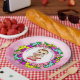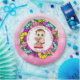 Girl's Baby Shower, Caucasian Baby with Teddy Bear Paper Plate.Pink purple and lots of pretty colourful flowers.