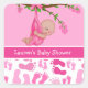 Personalise your Girl themed baby shower with these cute baby shower stickers. Design has pink footprints background and a baby girl hanging in a branch. Use stickers to decorate packages, as envelope seals, or give out as party favours.delightfuldoodles.