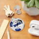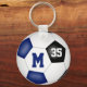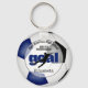 This team colours soccer keyring features the word "goal" with overlying silhouette of a female soccer player kicking a tiny soccer ball plus easily customisable athlete name, school/club and mascot name and year on the front and player monogram or varsity letter and jersey number on the back - background on the front and back is the realistic image of a soccer ball that has blue, black and white panels - by katz_d_zynes