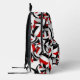 This cool volleyball backpack features a random pattern of varied size red, black & white volleyballs turned every which way on a white background - customise with the athlete's name & jersey number - by katz_d_zynes