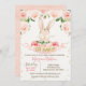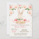 Sweet pink floral and bunny rabbit themed baby shower invitation featuring a pink and green floral arrangement in the top section of the design and a pink banner. This design is great for a little girl's bunny rabbit themed baby shower.