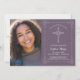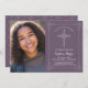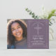 This elegant and classic confirmation invitation features a drawn white cross with a matching detailed border as well as a custom photo area. The example is shown in a purple colour, but the background colour can be customised to your liking. Perfect for your special religious occasion, the text can also be personalised for your event.