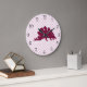 Pink girly wall clocks with cute dinosaur stegosaurus with pink polka dot background on the clock face. Decorative wall decor clock design for girls, kids, a baby girls room, or even a newborn baby.. Colours include pink, white and fuchsia.