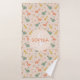 This cute pink kids bath towel set features a dinosaur cartoon pattern, with a t-rex, stegosaurus, rainbows and Jurassic jungle plants and flowers, and can be personalised with your girls name and monogram. The perfect dinosaur-themed gift for your dinosaur-loving baby, toddler or child!