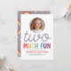 Celebrate turning two with this adorable “Two Much Fun” birthday invitation for girls! Featuring a modern retro colorful font and space to add your child’s photo on the front, plus a coordinating purple back with retro rainbows and stars. Perfect for a 2nd birthday party. Customisable with all your party details.
