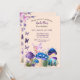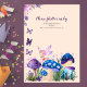 Fairy Wonderland Invitation: Turn your girl's birthday into a fairy wonderland with our charming invitations! The design includes purple and blue mushrooms, a fairy, and butterflies with purple flowers against a light pink background. Customizable details ensure a personal touch, and the mix of script and sans serif fonts adds whimsical elegance. The back reads "Please flutter on by" with space for more text, inviting guests to join the magical celebration. Capture the magic—get your fairy-themed invitations today!