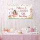 Fairy Tale Dream Birthday Banner: Make your child's birthday a fairy tale come true with our enchanting Banner. The design showcases a charming string of stars, mushrooms with a frog, and a cute fairy with a magic wand, all set against a soft light pink background with a distant castle. Personalise the name and age. The banner is part of a collection. Bring the magic to life – buy yours today!