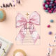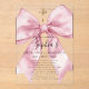 Blush pink watercolor coquette bow is decorated with roses and sage green greenery. A gold cross is placed above the text. The back is a chic pink and white stripe pattern. Your daughter's name is written in a beautiful calligraphy script. All text is editable.