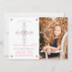 This elegant and pretty 5"x7" first holy communion photo invitation features a chalice surrounded by a fancy cross and the words "first communion". A perfect invite for your daughter's special religious occasion, the text, image, and background colour (on the back) can be customised to your liking.