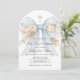 Delicate, timeless, and quietly breathtaking—this elegant First Holy Communion invitation is designed to honor one of life’s most meaningful milestones with grace and beauty. A soft dusty blue watercolor bow, adorned with creamy blush roses and subtle greenery, frames your event details like a cherished keepsake. The arched silhouette adds a modern, elevated touch, while the subtle cross above completes the design with a reverent, faith-centered focus.