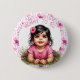 Mummy to be button. Cute personalised baby shower stickers with a cute dark haired baby girl with a pink flower in her hair, Pretty pink floral background with pink text.