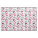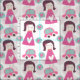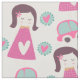 Fun, colourful, whimsical fabric great for girls, features little girls with pink dresses with a white heart, lots of pink cars, and hearts of pink on blue circles all on a white background.