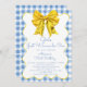 Girls Just Wanna Be One Yellow Blue 1st Birthday Invitation - Celebrate your little girl's first milestone with this cute, rustic and sweet first birthday invitation. Featuring a watercolor illustration of a yellow, coquette bow with a squiggle frame in white and yellow on a blue and white gingham pattern background. Perfect for a Onederful 1st Birthday celebration, Bow Birthday Party or Picnic Themed Yellow and Blue First Birthday. Available in both print and digital formats. Customise this editable first birthday party invitation for girls with your own event details.