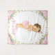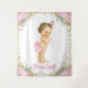 Girl baby shower backdrop with adorable baby girl with pretty pink ruffle pants and pearls on an elegant pink and gold floral background. This cute baby shower backdrop is easily customised with the text of your choice. You can also change the background colour.