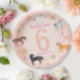 This cute girls’ birthday paper plate design features a pastel pink background with unicorns, horses, rainbows, and stars in a soft, magical style. The whimsical design adds a sweet, coordinated touch to any unicorn or horse-themed party. Check out our collection for matching party supplies.