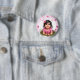 Auntie to be button. Cute personalised baby shower button with a cute dark haired baby girl with a pink flower in her hair, Pretty pink floral background with pink text.