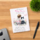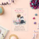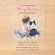 Translucent girl's pink and sage green baby shower invitations. Sweet baby girl sitting next to her little black and white Mini Aussie puppy dog in a patch of pretty watercolor flowers. Pink and sage green butterflies and pretty wildflowers.