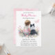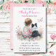 Girl's pink and sage green baby shower invitations. Sweet baby girl sitting next to her little black and white Mini Aussie puppy dog in a patch of pretty watercolor flowers. Pink and sage green butterflies and pretty wildflowers.