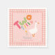 This cute and whimsical girls 2nd birthday napkin design features a silly goose with a pink party hat, with a gingham border, and can be personalised with your girls name. The perfect farm design for your little one's second birthday!