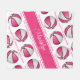 This cute basketball themed fleece blanket features the realistic images of basketballs that have alternating pink and white panels arranged in an angled mirrored pattern - the phrase "The basketball court is my happy place" in pink stretches between the angled rows of basketballs - athlete's name can be personalised on a similarly angled full width pink colour strip - background is customisable white - by katz_d_zynes