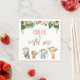 Cute girls safari themed birthday party paper napkin featuring four cute jungle animals, various coloured flowers and bold green jungle foliage. The faux gold calligraphy wild one heading is removable.