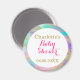 Colourful, personalised Baby Shower magnet with a white and unicorn rainbow colour background, gold glitter sparkles confetti, and elegant gold and hot pink writing. You can easily add the name of your choice and change the colour and font of the name using the customise option!