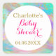 Colourful, personalised Baby Shower square sticker with a white and unicorn rainbow colour background, gold glitter sparkles confetti, and elegant gold and hot pink writing. You can easily add the name of your choice and change the colour and font of the name using the customise option!