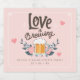 Elevate your bachelorette bash with our girly beer bottle label! Featuring a beer glass on a pink background, foliage, and 'love is brewing' text, it sets a feminine tone for the celebration.