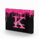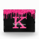 This trendy and unique glam girly design features hot pink fuchsia magenta glitter drips at the top and a large customisable monogram in bright pink in the centre in popular serif typography along with a customisable name in white in popular script with a hand-lettered look. The background includes brushed charcoal grey black onyx metal for added sparkle, a perfect way to brighten up your shelf, desk, or tabletop. You can personalise this item by changing the monogram and name in the product template.