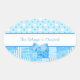 Personalise by adding the name of a girly girl to these cute blue country style oval stickers with a patchwork quilt design on the bottom and a pretty light blue heart pattern on the top and decorated with a blue bow. Flat printed image, not actual ribbon.