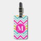 Spot your luggage from far away with this stylish acrylic luggage tag done in a bright pink, aqua, yellow, green, lavender and white chevron zigzag pattern. The front has a round hot pink disc on top of the pattern, with a custom bold white one letter monogram. The back is solid bright pink, with white text ready to personalise.