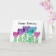 Cute and girly birthday card with pink, blue and purple flowers and green leaves.