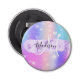 Girly and cute bottle opener with a colourful pink, purple, lilac, blue and green unicorn rainbow hearts sparkly background. Your custom name and monogram are written in an elegant hand lettered script with a lilac purple unicorn paint brush strokes stripe background. A perfect birthday or Christmas gift!