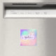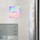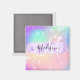Girly and cute magnet with a colourful pink, peach, purple, lilac, blue and green unicorn rainbow hearts sparkly background. Your custom name and monogram are written in an elegant hand lettered script with a lilac purple unicorn paint brush strokes stripe background. A perfect birthday or Christmas gift!