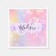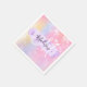 Girly and cute napkin with a colourful pink, peach, purple, lilac and blue unicorn rainbow hearts sparkly background. Your custom name and monogram are written in an elegant hand lettered script with a lilac purple unicorn paint brush strokes stripe background.