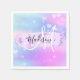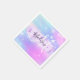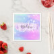 Girly and cute napkin with a colourful pink, purple, lilac, blue and aqua unicorn rainbow hearts sparkly background. Your custom name and monogram are written in an elegant hand lettered script with a lilac purple unicorn paint brush strokes stripe background.