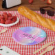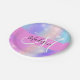 Girly and cute paper plate with a colourful pink, purple, lilac, blue and green unicorn rainbow hearts sparkly background. Your custom name and monogram are written in an elegant hand lettered script with a pink background.