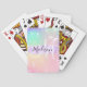 Girly and cute playing cards with a colourful pink, peach, purple, lilac, blue and green unicorn rainbow hearts sparkly background. Your custom name and monogram are written in an elegant hand lettered script with a lilac purple unicorn paint brush strokes stripe background. A perfect birthday or Christmas gift!