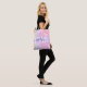 Girly and cute tote bag with a colourful pink, peach, purple, lilac and blue unicorn rainbow hearts sparkly background. Your custom name and monogram are written in an elegant hand lettered script with a lilac purple unicorn paint brush strokes stripe background. A perfect birthday or Christmas gift!