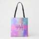 Girly and cute tote bag with a colourful pink, purple, lilac, blue and green unicorn rainbow hearts sparkly background. Your custom name and monogram are written in an elegant hand lettered script with a pink background. A perfect birthday or Christmas gift!