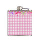 Whimsical lady's flask with graphics of two polka dot colourful martini glasses on a pink and white gingham background.  A band of colourful pink, green, and purple flowers decorate around the top of the flask.  Pink text is ready to personalise for your favourite party girl or for yourself.