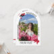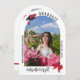 Cute arch-shaped graduation party invitation with girly red bows and ribbon details, red and matte black fonts, and your daughter's photo. Girly graduation party invitation and graduation announcement in one, personalised with the graduate's arch-shaped photo on the cover and party invitation on the back with cute bow details in red, the graduation cap adorned with a big red bow.
