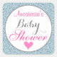 Girly and glam light sky blue glitter sparkles princess Baby Shower square sticker with hot pink and grey writing. You can easily add the name of your choice and change the colour and font using the customise option!