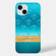 This turquoise and gold metallic phone case design is elegant and trendy, decorated with sparkly fleur-de-lis and a gold band to frame the personalized name.