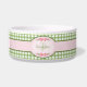 A cute country style green gingham monogram pet dish with a pink gingham label and a girly filigree pink ribbon. Personalise by adding your name and initials. Will appeal to the stylish and feminine girl.